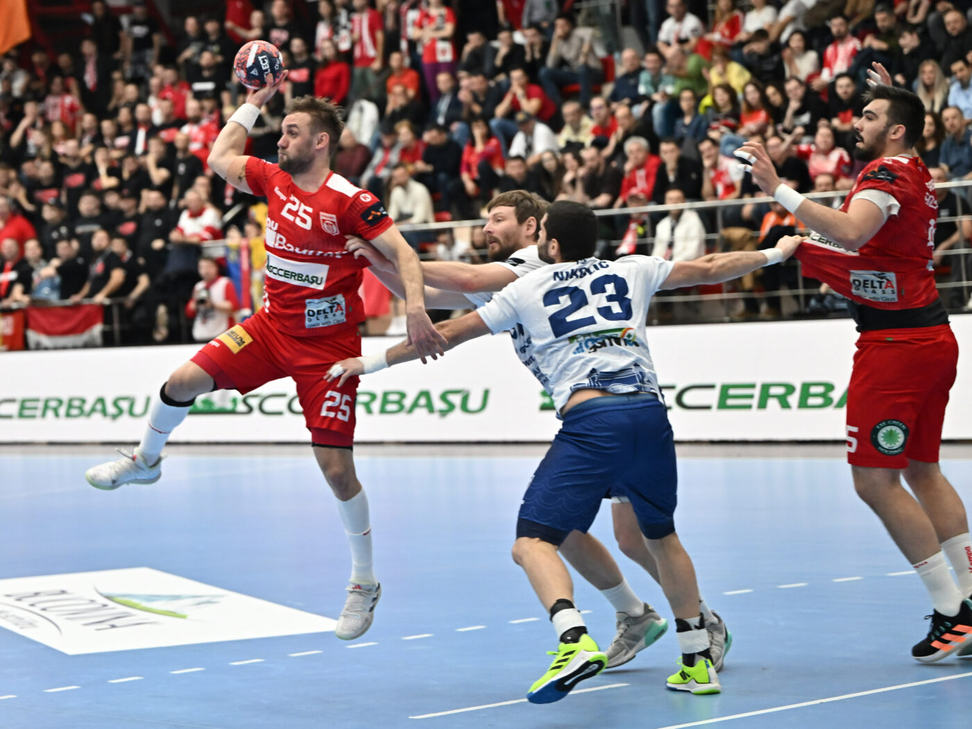 Luka Cindric si Rosta Miklos in meciul de handbal masculin dintre Dinamo Bucuresti si CSM Constanta, din cadrul EHF European League