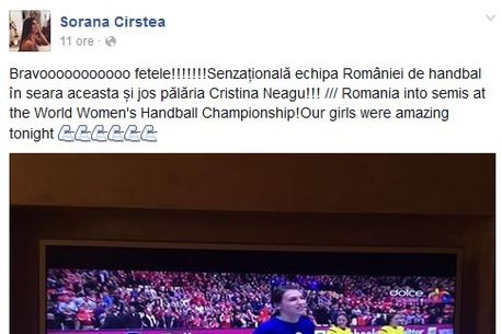 Imediat ce sportivele antrenate de Tomas Ryde și Costică Buceschi au triumfat eroic la capătul a două reprize de prelungiri, Sorana a postat un mesaj de apreciere pe paginile personale de Facebook și Twitter: „Bravooo fetele!!! Senzațională echipa de handbal a României în seara aceasta”! Sorana, aflată acum pe locul 241 WTA, a avut și o favorită printre jucătoarele care s-au luptat superb în fața a 15.000 de spectatori danezi. Cristina Neagu a marcat nu mai puțin de 15 goluri aseară, iar Sorana Cîrstea a felicitat-o în mod special pe cea care a fost desemnată jucătoarea meciului: „Jos pălăria, Cristina Neagu”.