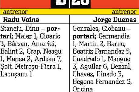 • O cauză a eșecului de aseară a reprezentat-o lipsa de eficacitate a jucătoarelor noastre la aruncările de la 9 m. România a transformat în gol doar 3 din cele 20 de mingi trimise spre poarta ibericelor, însă nici Spania n-a strălucit la acest capitol (6 din 22).