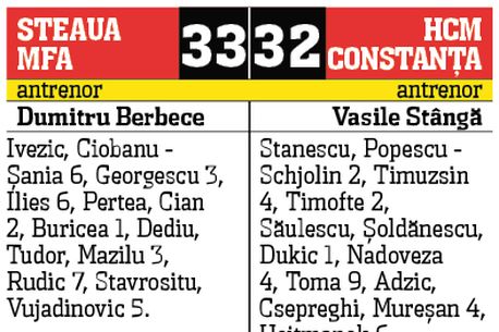 Rănită în orgoliu, fosta campioană, Constanța, și-a dorit nespus să-și ia revanșa în fața Stelei. „Marinarii“ au început tare, s-au desprins la 3-1, dar au fost incomodați vizibil de apărarea avansată a Stelei. Baloanele recuperate în defensivă de roș-albaștri s-au concretizat în goluri înscrise pe contraatac, iar balanța s-a înclinat în sens invers: 7-4. A fost momentul în care a ieșit la rampă Daniel Mureșan, jucătorul primei reprize pentru HCM. Interul dreapta a perforat poarta adversă de câteva ori, iar încercările defensivei „militare“ de a-l anihila au creat spații în apărare pentru pivoți. La pauză s-a intrat nedecis, 12-12, Steaua strălucind prin Șania și bătăiosul Ilyeș.