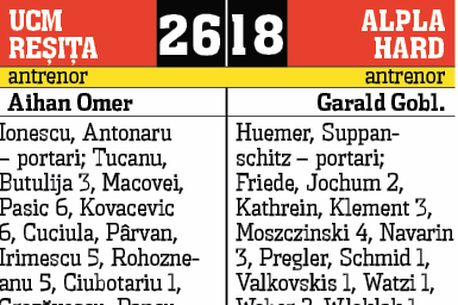 Izbânda a stat însă sub pavăza portarilor Antonaru și Ionescu! Postul care le-a dat atâtea bătăi de cap în trecut reșițenilor a fost ieri cartea câștigătoare. Cu un asemenea baraj în față, Alpla a găsit atât de greu drumul spre gol încât în minutul 20 abia înscrisese de două ori! Reșița a zburdat astfel spre o victorie zdrobitoare, scor 26-18 (10-6), la finele unui meci teribil. Suferința lui Butulija, prăbușit pe parchet la final sub povara durerilor de la umăr, stă mărturie pentru cronica acestei epopei.