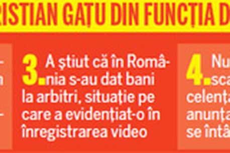 Lumea handbalului este bulversată. După "Scandalul Sexcelența", la rampă a apărut și "Scandalul mită pentru arbitri". Au trecut deja două săptămâni, însă reacțiile ferme ale FRH au întârziat să apară. Cristian Gațu este văzut între principalii vinovați, motiv pentru care oamenii din fenomen îi cer demisia.