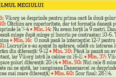 Ieri, Oltchimului i-au lipsit mai toate ingredientele pentru a face un pas spre finala Ligii Campionilor. A avut doar câteva sclipiri, însă insuficiente pentru a răpune o echipă mondială de talia Viborgului. Apărarea a fost deseori depășită, însă problemele adevărate au fost în atac, unde axul central a fost ca și inexistent. Și cum cu o Narcisă nu se face primăvară – Lecușanu a fost singura care a avut un joc aproape de ceea ce se aștepta – mingea a ajuns cu greu în poarta celui mai bun portar din 2008, Katrine Haraldsen.