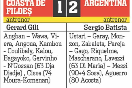 Și, într-adevăr, cu un Messi fenomenal, Argentina a pășit cu dreptul. Chiar dacă jocul campioanei olimpice en-titre a mai scârțâit, au fost de-ajuns două acțiuni senzaționale ale atacantului de la Barcelona pentru a se decide câștigătoarea. „Pumele“ s-au impus în cele din urmă cu 2-1, goluri Messi (43), după o pasă genială „marca Riquelme“, și Acosta (86), din 2 metri, după un șut respins de portarul african, respectiv, Cisse (53), lovitură de cap la colțul lung. Coasta de Fildeș a evoluat surprinzător de curajos și a reușit în multe momente ale jocului să domine autoritar. Și dacă nu era arbitrul Stark, care a închis ochii la un fault clar în careu asupra lui Gervinho, africanii puteau scoate un rezultat pozitiv.