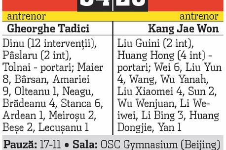 Naționala feminină de handbal este tot mai convingătoare în turneul olimpic. În jocul secund, România a „transformat“ China într-un sparring-partner. Tricolorele au intrat pe teren decise să-și facă partida cât mai ușoară și n-au oferit prea multe șanse adversarelor. China a încercat să pună România în dificultate printr-o apărare avansată și agresivă, dar trupa pregătită de Tadici și Muși a avut soluțiile necesare. Carmen Amariei a „spart“ în nenumărate rânduri zidul chinezesc, iar Ionela Gâlcă-Stanca a fost stăpână pe semicercul advers. Apărarea și poarta au funcționat, la rândul lor, la parametrii scontați, astfel că diferența s-a făcut încă din prima repriză (17-11 la pauză). Gazdele au picat și fizic în actul secund, astfel că prima reprezentativă și-a permis să lucreze și la golaveraj. La final, România s-a impus cu 34-20 și a pus deja gând rău următorului adversar, Franța.