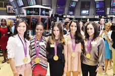 Campioane olimpice cu echipa SUA, Kyla Ross, Gabby Douglas, McKayla maroney, Aly Raisman și Jordyn Wieber au aprins lumina pe Empire State Building, New Yorkul fiind scăldat în luminile steagului american. Foto: EPA