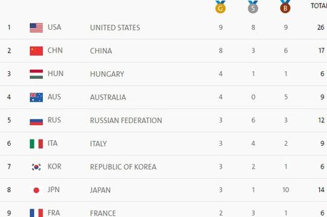 Clasamentul pe medalii în acest moment, în care au pătruns 47 de națiuni, se prezintă astfel: