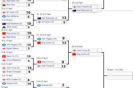 Sferturile de finală ale Mondialului de snooker din acest an încep marți, de la ora 12:00, cu prima sesiune a jocurilor Ding Junhui – Judd Trump și Anthony McGill – Shaun Murphy.