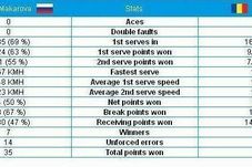 02:50 Makarova își adjudecă primul set, 6-4, după 39 de minute. Ea a concretizat 2 șanse de break din cele 3 avute, în timp ce Simona a concretizat o singură șansă din cele 4 avute.
