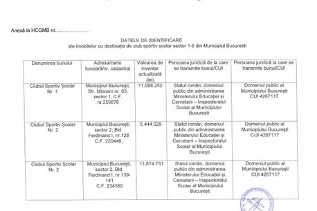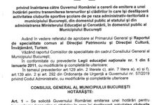 Art.1.Se solicită Guvernului Romaniei emiterea unei hotărâri pentru transmiterea terenurilor și clădirilor în care își desfășoară activitatea cluburile sportive școlare de pe raza administrativ-teritorială a municipiului București din domeniul public al statului și din administrarea Ministerului Educației și Cercetării, în domeniul public al Municipiului București pentru activitatea sportivă de performanță.