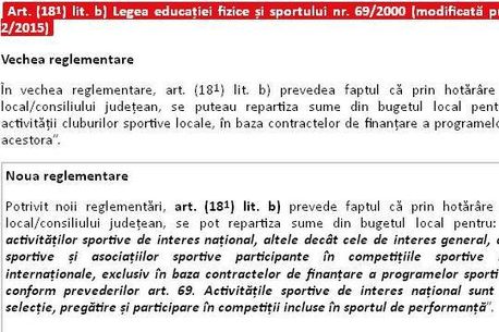 Gândită să revitalizeze un pic Legea Sportului (nr.69/2000), veche de 15 ani, Ordonanța de Urgență nr. 2/2015 a fost emisă de Guvern pentru a modifica și completa unele acte normative. Noua reglementare prevede faptul că, prin hotărâre a Consiliului Local / Consiliului Județean, se pot repartiza sume din bugetul local pentru finanțarea sportului de performanță. Altfel spus, noua Ordonanță de Urgență vine în sprijinul alocării de fonduri bugetare de către Consiliile Județene către cluburile sportive, alocare care se făcea până acum pe Legea 350, privind regimul finanțărilor nerambursabile din fonduri publice alocate pentru activități nonprofit de interes general. Toate bune și frumoase, numai că noua O.U.G nu are normele de aplicare legislativă a articolului 69 din Legea Sportului, adică nu se precizează în ce direcții pot fi folosiți banii de la bugetul de stat, totul fiind lăsat la libera interpretare. Această omisiune a blocat complet aplicarea ei.