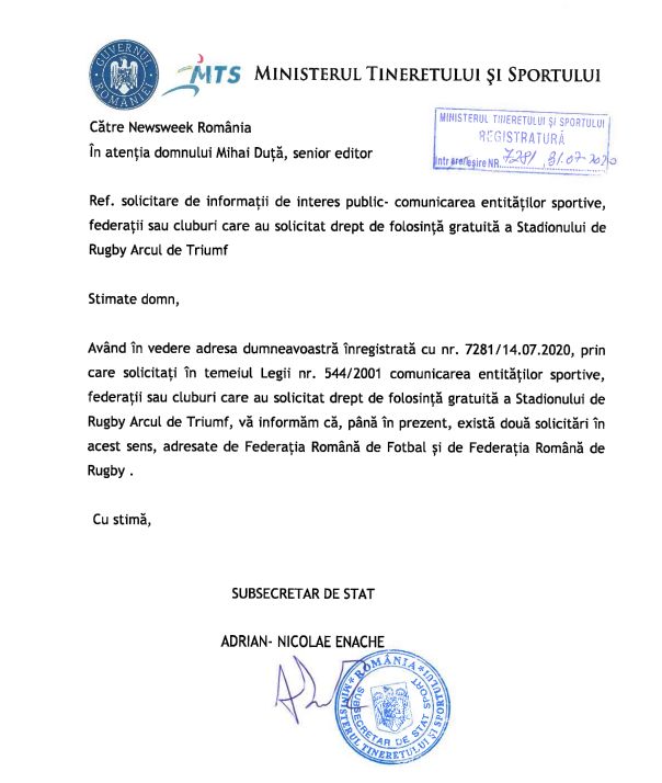 Documente oficiale arată clar acum că FRF s-a implicat pentru a prelua arena în folosință gratuită. Între timp, Ministerul Tineretului și Sportului a precizat, la solicitarea Newsweek Romania, că, pe lângă Federația Română de Rugby, a solicitat drept de folosință gratuită a noului stadion și Federația Română de Fotbal, instituție care nu apare în niciun document până acum și care n-a avut nicio contribuție financiară.