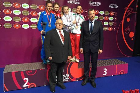 Medaliatele categoriei 48 de kg în proba feteleor de la Campionatul European de lupte: aur pentru Maria Stadnik (Azerbaidjan), argint pentru Alina Vuc (România, stânga) și bronz pentru Elița Iankova (Bulgaria) și Marina Markevici (Belarus).