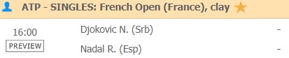 Finala va putea fi urmărită în direct pe unul din canalele Eurosport, nu mai devreme de ora 16:00. Indiferent de rezultatul finalei, Djokovic va rămâne lider mondial, în timp ce Nadal își va păstra locul 2. Nadal a câștigat ultimele 3 dueluri directe pe zgură (Madrid 2017 și Roma 2018 și 2019).