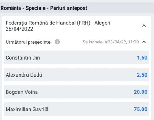 Realegerea lui Alexandru Dedu avea, acum 48 de ore, o cotă de 1.75, dar s-a prăbușit rapid la 2.50. Constantin Din, fostul arbitru internațional, are acum 1.50, față de 2.10 acum două zile.