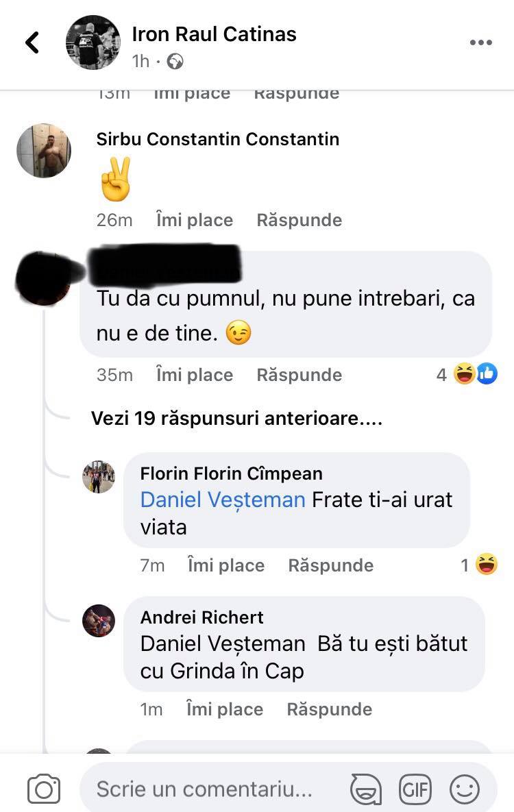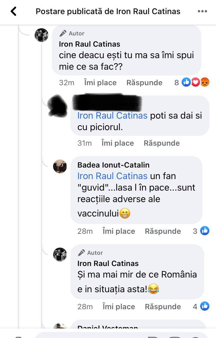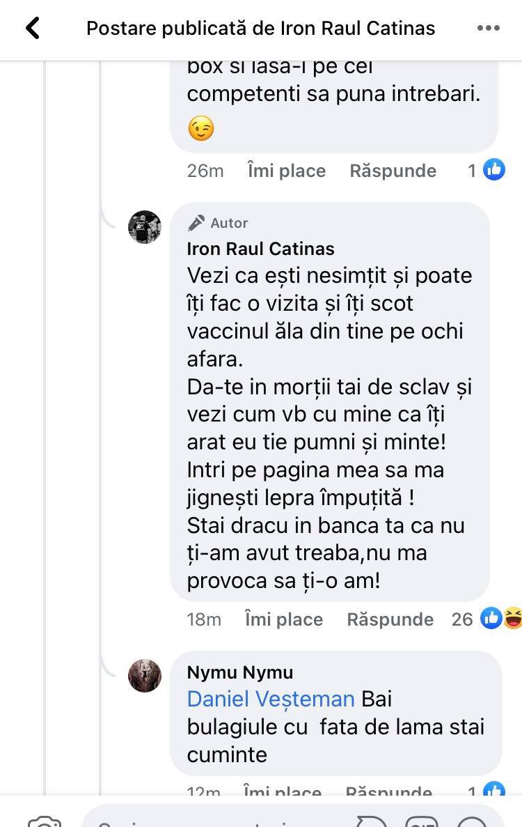 „Vezi că ești nesimțit și poate îți fac o vizită și îți scot vaccinul ăla din tine pe ochi afară. Dă-te în m**ții tăi de sclav și vezi cum vorbești cu mine că îți arăt eu ție pumni și minte! Intri pe pagina mea să mă jignești, lepră împuțită! Stai dracu în banca ta că nu ți-am avut treaba, nu mă provoca să ți-o am!”, a replicat Raul Cătinaș.