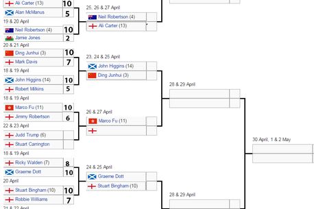 Revenit după ce a învins cancerul pulmonar, Ali Carter a reușit un meci excelent, aproape fără greșeli majore, în duelul cu scoțianul Alan McManus, pe care l-a învins fără probleme, scor 10-5. Carter va juca, însă, în turul doi cu unul dintre cei mai în formă jucători de la Crucible, australianul Neil Robertson.