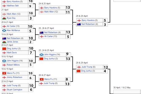Nici Robertson nu a avut un meci prea ușor cu Barry Hawkins. Australianul, care pierduse doar șapte frame-uri în primele două runde, a cedat deja cinci jocuri în sfertul de marți, deși a condus cu 3-1! Cu un mix între o scădere incredibilă a formei sale și un ascendent moral al lui Hawkins, finalist la Crucible în 2013 și semifinalist anul trecut, jocul s-a schimbat complet după pauza dintre jocurile 4 și 5, iar Hawkins a câștigat următoarele patru frame-uri pentru a face 5-3! Oricum, nici O’Sullivan, nici Robertson nu vor avea mari emoții, întrucât învingătorul trebuie să ajungă primul la 13 frame-uri, astfel că jocurile sunt lungi.
