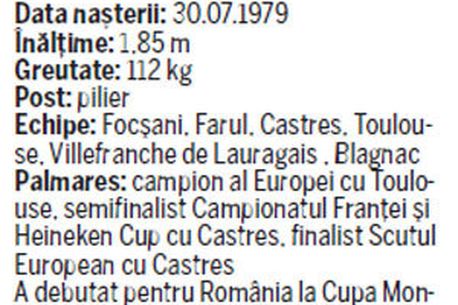 Cu o carte de vizită impresionantă, câștigătorul celui mai prestigios trofeu intercluburi din Europa, Heineken Cup, un fel de Cupa Campionilor la fotbal, Dima (32 de ani) s-a reîntors după trei ani în echipa națională. Jucătorul din Focșani a lăsat în urmă o dublă operație de hernie de disc, doi ani de recuperare și de muncă asiduă de a reveni pe teren, a strâns din dinți și a crezut nebunește în visul lui de a îmbrăca încă o dată tricoul brodat cu frunza de stejar. Astfel, peste 29 de zile, Dragoș va bifa, după 12 ani, o nouă ediție a Cupei Mondiale, după cea din 1999, când a debutat, pentru „stejari”, cu Australia.