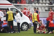 Salvarea a intrat de urgență pe teren la scorul de 6-0 pentru Dinamo, după ce Kefentse Mahlo, jucătorul celor de la Baia Mare, a suferit o comoție şi toată lumea s-a speriat.