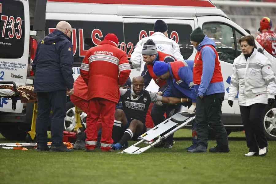 Totuși, sud-africanul celor de la CSM Baia Mare a fost scos în afara terenului, pentru a fi consultat și monitorizat suplimentar de medicii de pe ambulanță.