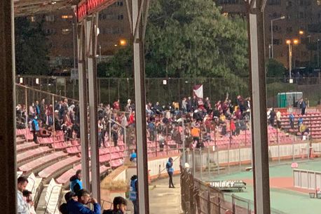 Suporterii rapidisti cu steaguri si fulare isi incurajeaza favoritii la meciul de fotbal dintre CS Mioveni si Rapid Bucuresti, contand pentru Play-out-ul Ligii 1 Casa Pariurilor, desfasurat pe Stadionul Orasenesc din Mioveni, luni 16 mai 2022. © FOTO:Razvan Pasarica/SPORT PICTURES