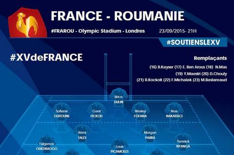 Selecționerul României, Lynn Howells, a anunțat luni, cu două zile mai devreme, XV-le care va intra în teren cu Franța (miercuri, ora 22:00), în meciul de debut al „stejarilor” la Cupa Mondială de rugby din Anglia. România va miza pe cea mai experimentată echipă care a jucat vreodată la Cupa Mondială, atât din punct de vedere al numărului de selecții, cât și al vârstei medii.