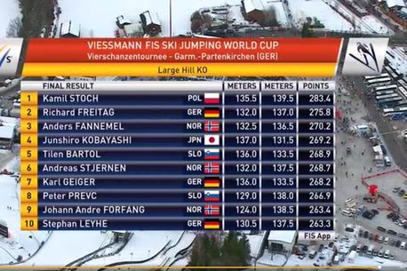 Kamil Stoch are avantaj de 11,8 puncte în clasamentul general al Turneului Celor patru trambuline în fața germanului Richard Freitag, care păstrează șefia la general în Cupa Mondială. Stoch a reușit însă să spargă monopolul german în lupta pentru globul de cristal, depășindu-l pe Andreas Wellinger.