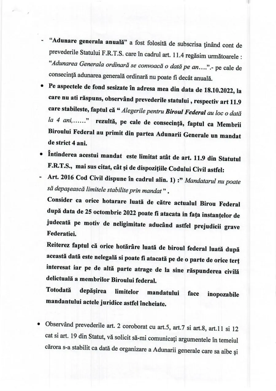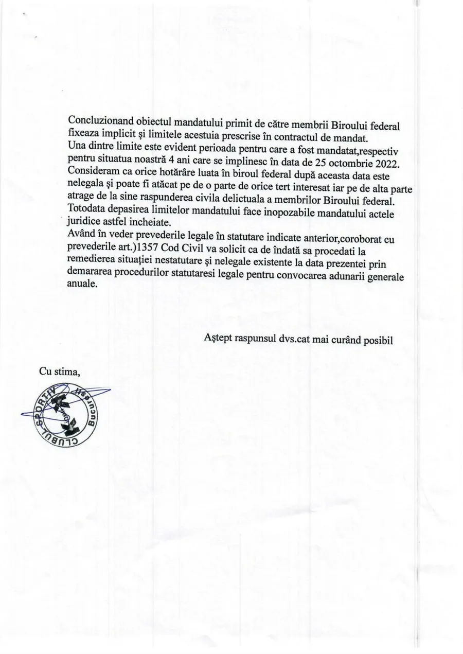 „Noi le-am făcut o adresă oficială, pe care au şi publicat-o pe site-ul federaţiei în care le aduceam în atenţie că lor le-a expirat mandatul pe 25 octombrie. Dar cu 29 de zile înainte au făcut o şedinţă a Biroului Federal, prin care şi-au prelungit mandatul până în martie anul următor. Pentru noi e ceva de neînţeles. Le-am cerut oficial să ne explice cum au făcut asta, dar nu am primit un răspuns clar. După aia, au făcut un nou Birou Federal, care e ilegitim de vreme ce i-a expirat mandatul, şi au mutat alegerile pe 28 decembrie. Nimeni nu cred că poate înţelege cum şi-au prelungit acest mandat”, susţine Marian Cărbunaru.