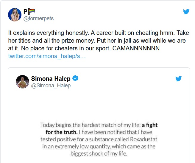 Un alt fan a avut un mesaj extrem de dur la adresa româncei: „Asta explică totul, sincer! O carieră construită pe înșelăciune, hmm! Luați-i titlurile și toate premiile în bani. Trimiteți-o la închisoare, pentru că nu există loc pentru trișori în sportul nostru”.