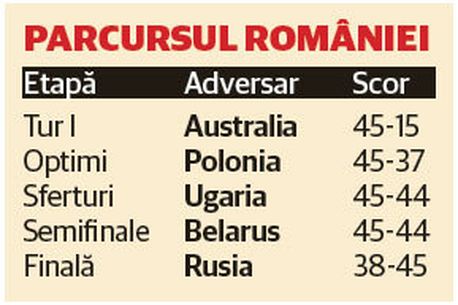 Cum a fost drumul până în finală? Cel mai bine ne-a explicat chiar antrenorul Mihai Covaliu: „Niciun duel nu a fost ușor. Am ajuns în finală prin multă muncă, răbdare, încredere și printr-un studiu extrem de atent al adversarilor. Sincer să fiu, nu mă așteptam la un asemenea parcurs”. Până în finala cu Rusia, România a trecut pe rând de Australia, Polonia, Ungaria și Belarus. Cu ultimele două reprezentative victoria a venit la o singură tușă: 45-44!
