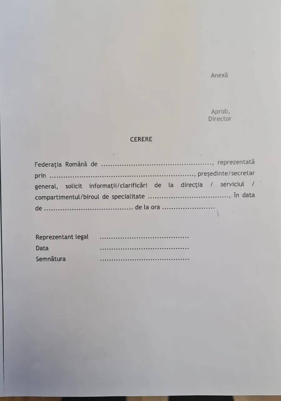 Cererea trebuie să fie semnată de către președintele federației care dorește aceste informații și avizată, ulterior, de către șeful fiecărui departament în parte. Răspunsul poate veni după pofta inimii.