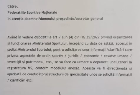 În urmă cu două zile, toți președinții de federații au primit de la cabinetul ministrului sportului o circulară privind organizarea și funcționarea Ministerului Sportului.