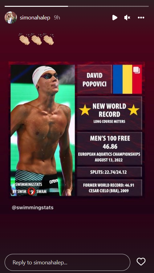 Pe Instagram, la secțiunea „Povestea Mea”, Simona Halep a distribuit o fotografie cu David Popovici, imediat după finala la 100 de metri liber, aplaudându-l virtual cu mai multe emoji pentru medalia de aur câștigată.