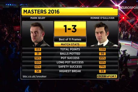 O’Sullivan a debutat cu joc câștigat, a pus 50 de puncte diferență între el și Selby și în jocul doi, însă „Bufonul” a primit o șansă importantă, furându-i lui Ronnie jocul pentru doar șapte puncte. Închiderea de masă a părut inaccesibilă pentru O’Sullivan, care a ratat din nou, la bila albastră, în jocul trei. Cele 69 de puncte strânse de O’Sullivan au fost însă suficiente, chiar dacă Selby a revenit la masă, încercând să recupereze punctele lipsă, prin trei snookere. „Racheta” a rămas totuși în control la masă, evitând un nou joc scăpat printre degete și a plecat la cabine cu avantaj de două jocuri.