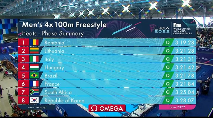 Echipa României, formată din Alexandru Constantinescu, David Popovici, Ștefan Cozma și Patrick Dinu, și-a devansat adversarii cu fix două secunde, calificându-se cu cel mai bun timp în finală.