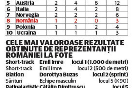 Trei medalii, două la short-track obținute de Emil Imre și una agățată de gâtul biatlonistei Dorottya Buzas, locul 8 pe națiuni (!) și alte câteva prestații remarcabile. Acesta este bilanțul României la a 11-a ediție a Festivalului Olimpic al Tineretului European, încheiat aseară în Poiana Brașov. O întrecere în care România s-a autodepășit, în primul rând prin impresia artistică a sportivilor. Niciodată țara noastră nu a terminat atât de sus într-o competiție a sporturilor de iarnă, fie că a fost vorba de Jocuri Olimpice, Mondiale sau Festivaluri Olimpice ale tineretului. Și din punct de vedere organizatoric, România a trecut cu brio examenul, cazarea și infrastructura fiind apreciate de specialiștii veniți din afară. Consecințe? S-au deschis deja discuțiile cu oficiali ai forurilor internaționale ca diverse competiții să fie aduse în anii următori pe bazele sportive din țară. Chiar și o nouă ediție a Universiadei.