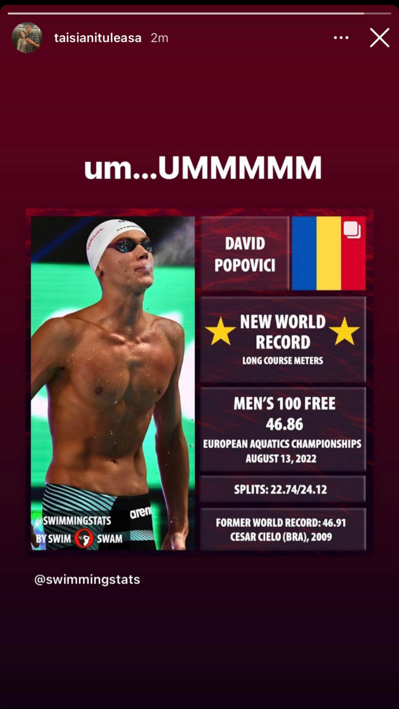 Adolescenta care este elevă la Colegiul Național Bilingv George Coșbuc din București a postat o fotografie în care apare David Popovici, alături cu toate informațiile despre cursa în urma căreia a devenit cel mai rapid înotător din lume, dar și mesajul: „Um… UMMMM”, ceea ce pare că aceasta are un cod secret cu David Popovici.