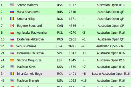 Clasamentul WTA în timp real pentru tenismenele rămase în cursă la Australian Open: