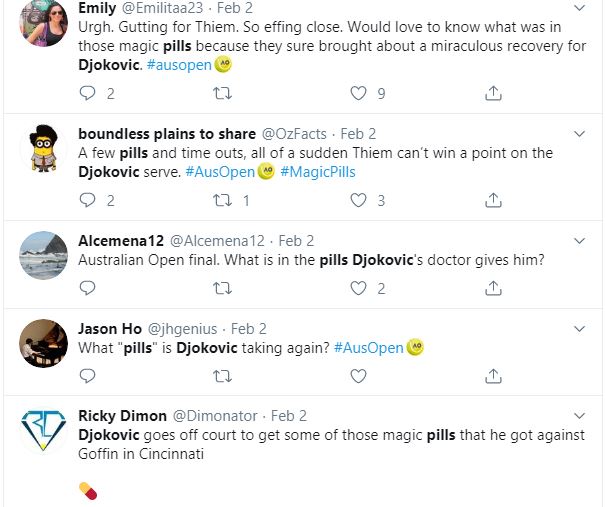 Mai mulți useri pe tweeter au cerut ca oficialii ITF să investigheze ce conțin pastilele „magice” care l-au revigorat pe Nole. Și în timpul semifinalei pe care a câștigat-o ușor cu Roger Federer, în minimum de seturi, Novak Djokovic a cerut un time-out medical, după ce începuse greu partida.