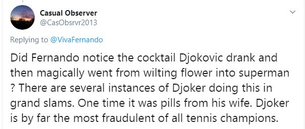 Revenirea lui Djokovic după ce părea dominat în seturile doi și trei a fost aplaudată de mulți dintre fanii tenisului, dar au fost și alții care privesc cu mare suspiciune revenirea spectaculoasă a sârbului. Mai ales că totul a venit după ce Nole a cerut o pauză medicală înainte de startul setului patru, când era condus, și a mers la vestiare. A luat câteva pastile, iar apoi jocul său s-a schimbat total.