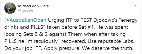 „Cei de la ITF ar trebui să investigheze de urgență ce conțin energizantele și pastilele pe care Djokovic le-a luat înainte de setul 4. Pierde clar seturile 2 și 3, iar apoi își revine ‘miraculos’ după ce ia acele pastile. Folosiți laboratoare cu reputație. ITF, faceți-vă datoria! Merităm să știm adevărul!”, a fost unul dintre mesajele fanilor.