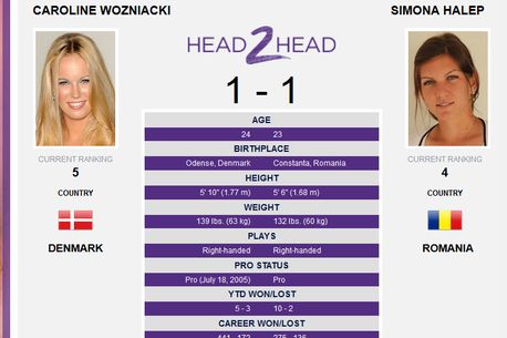 Wozniacki, care în 2014 a jucat finală la US Open – pierdută la Serena Willaims și semifinală la Turneul Campionelor – unde a fost învinsă tot de buna sa prietenă din SUA, se anunță un adversar complicat pentru Simona, care nu a reușit până acum la Dubai o evoluție constantă de la primul până la ultimul punct. Pentru Wozniacki, cel mai greu meci al turneului a venit în primul duel, din turul doi, împotriva australiencei Sam Stosur, daneza ieșind învingătoare la capătul unui maraton de două ore și 41 de minute, scor 4-6, 6-1, 7-5.