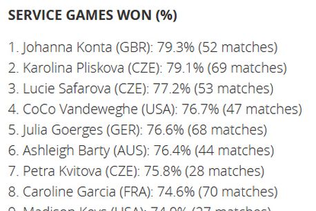 Britanica Johanna Konta, care i-a barat Simonei Halep drumul la Wimbledon, este sportiva cu cel mai bun procentaj la game-uri câștigate pe serviciu. Konta a mai impresionat la un capitol: este una dintre cele două sportive care au câștigat mai multe puncte pe serviciul doi în 2017 decât au pierdut – adică are procentaj de reușită de peste 50%.