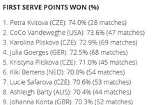 Karolina Pliskova, una dintre cele cinci jucătoare care au avut WTA în 2017, este lider detașat la capitolul ași. Chiar dacă a servit cu aproape 100 de ași mai puțin decât în 2016, cehoaica încă este de neatins din acest punct de vedere (452 ași în 2017, față de 530 în 2016). Mai mult, se dovedește faptul că atunci când vine vorba de serviciu, Cehia are cea mai bună școală: stângacele Kvitova și Safarova, dar și ambele surori Pliskova își trec numele în Top 10 la parametrii importanți.