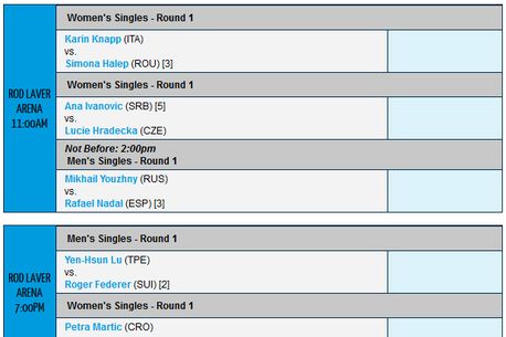 Halep, a treia favorită a tabloului feminin, va disputa partida din primul tur împotriva italiencei Karin Knapp (51 WTA) pe Rod Laver Arena, într-o primă zi cu trei meciuri de pe tabloul feminin programate pe Central. Cele două jucătoare din Top 4 WTA încadrează frumos acțiunea de pe primul teren care a primit acoperiș în Australia: Maria Șarapova, cap de serie numărul doi, închide sesiunea de seară, împotriva croatei Petra Martic.