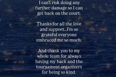 „A trebuit să iau decizia dificilă să mă retrag pentru a trata o problemă de sănătate apărută după ultimul meu meci. Eram foarte entuziasmată să continui, iar această competiție însemna foarte mult pentru mine, așa că faptul că trebuie să mă opresc aici îmi frânge inima, dar nu pot risca să agravez problema pentru a putea reveni pe teren.