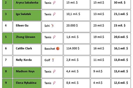 Nu mai puțin de 7 tenismene sunt în Top 10, ba chiar întreg podiumul e al lor! Deși banii din merite sportive sunt o parte însemnată a veniturilor, fetele câștigă mai mult din publicitate, cu două excepții justificabile, sportivele din zona ex-sovietică. Astfel, Aryna Sabalaenka, locul 2, își echilibrează perfect veniturile între tenis și publicitate, în timp ce Elena Rîbakina, locul 9, fire mai introvertită, este dependentă de câștigurile din tenis, ea neavând tracțiune deosebită pe partea de marketing.