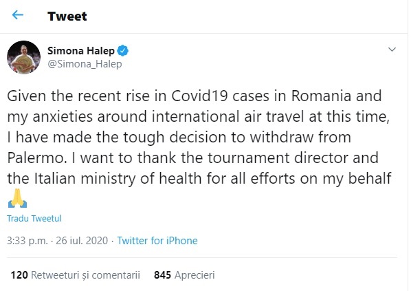 „Având în vedere creşterea recentă a numărul cazurilor de Covid-19 în România şi anxietăţile mele referitoare la zborurile internaţionale, am luat decizia de a mă retrage de la Palermo. Vreau să mulţumesc directorului turneului şi ministrului Sănătăţii pentru toate eforturile făcute”, a anunţat Simona Halep pe Twitter.