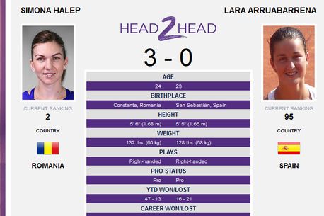 Arruabarrena nu i-a pus până acum probleme Simonei Halep, nereușind să depășească patru game-uri câștigate în vreunul dintre cele opt seturi jucate. Recent învingătoare la Seul, la dublu, alături de Andreja Keplac, Lara are în plus dezavantajul de a fi jucat mult în ultimele zile (inclusiv un meci de trei ore cu McHale, sâmbătă). Ruperile de ritm ale Simonei, în ultimele două partide cedate pe tărâm asiatic, au fost complet neinspirate, iar Arruabarrena este genul de jucătoare care se descurcă bine în preajma plasei, însă chiar dacă specialiștii au observat o creștere în jocul său, personal best-ul său rămâne clasarea din mai 2013, pe locul 70 WTA.